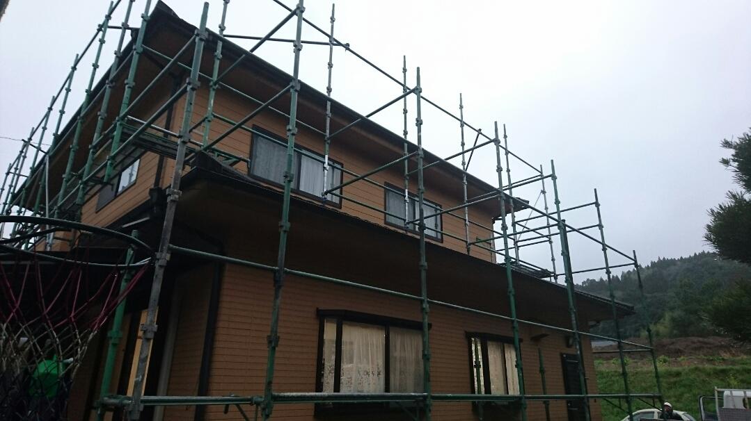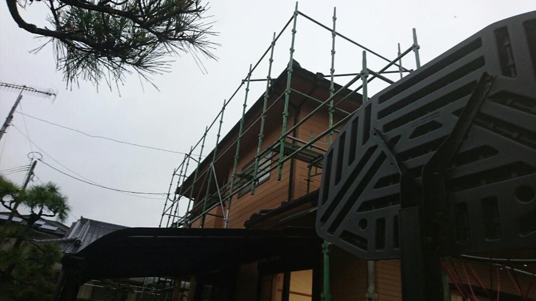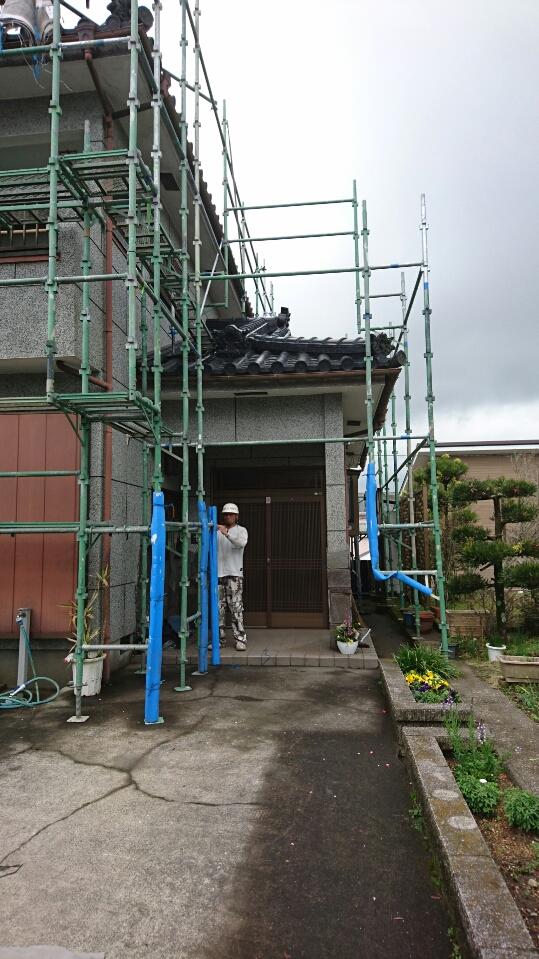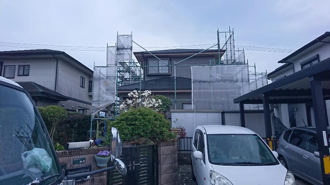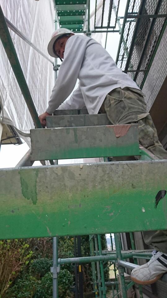 川内の現場も、外壁塗装のみの足場組み立てでしたが、強度や補強の関係もあって、普通の組み方をして4時半頃にシート張りまで完了でした!
