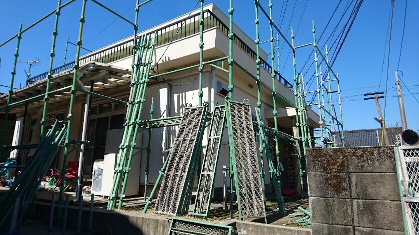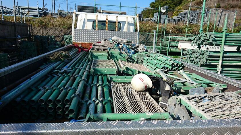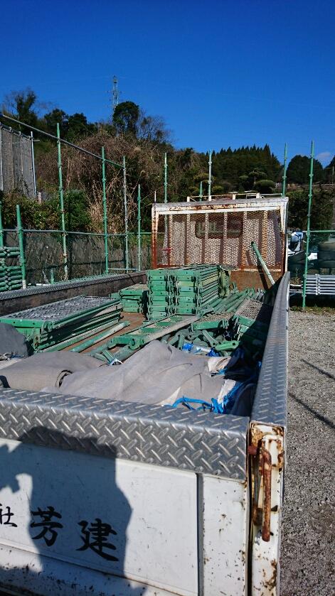 現場に向かうまでは、かなりの寒さだったのですが、作業をしているうちに、段々と陽が照りだして暖かくなり、終わる頃には快適な天候になり、そのまま解体した材料で、加治木町に向かい鉄筋コンクリート造りの一般住宅の足場組み立て作業に入りました!(^^)