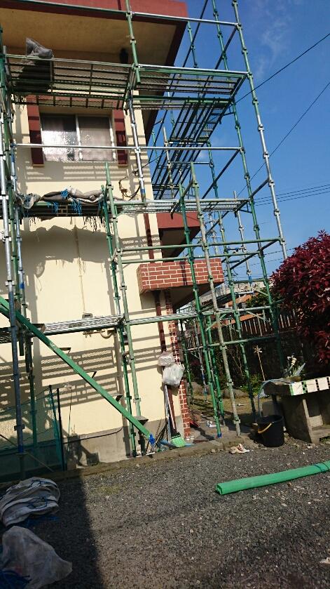 今日の午前中は、五光施工の応援で谷山中央で屋根外壁塗装用の足場組み立てでした!