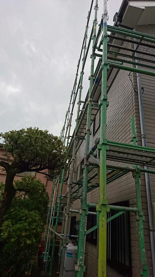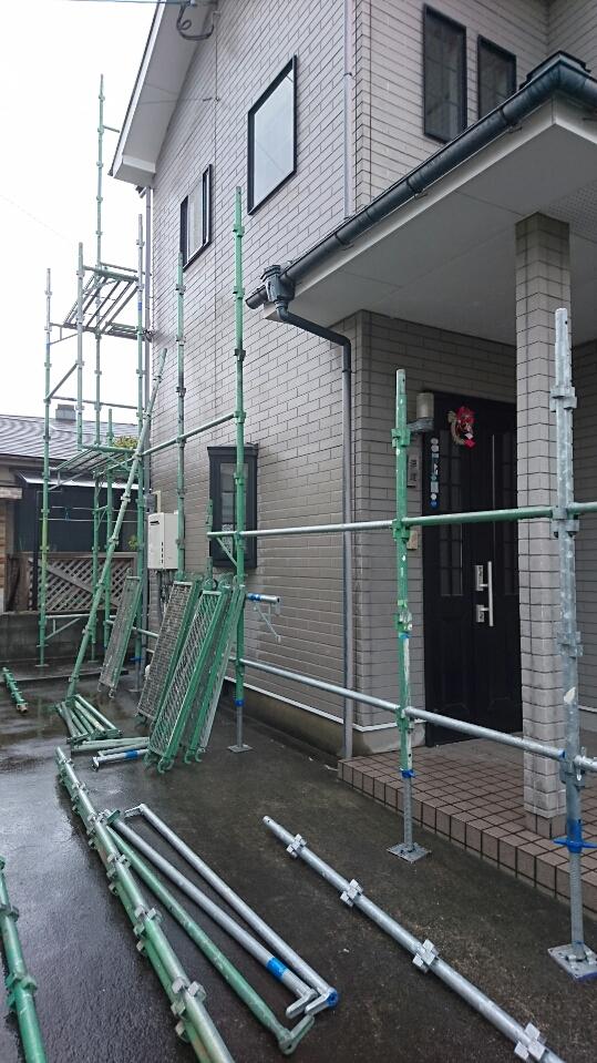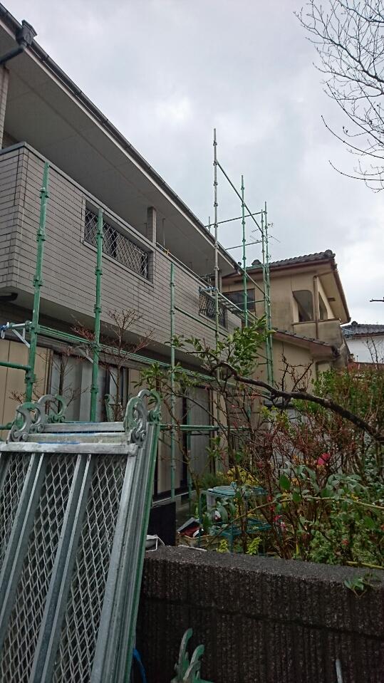 鹿児島市坂之上町で、屋根外壁塗装の足場組み立て作業をしています!